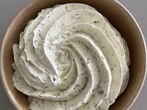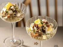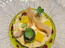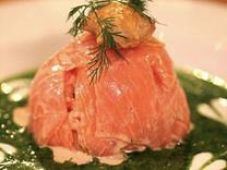 Bonbon van gerookte zalm gevuld met rivier kreeft en roomkaas, met daarbij Eén vinegrette van bieslook en een kruidensla