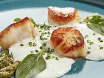 Gebakken coquilles(3 stuks) met kreeftensaus•kruiden orzo en groene asperges