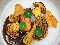 Rundersukade zacht gegaard in eigen jus met truffel fregola•gebakken paddenstoelen•truffel saus