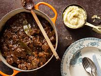 Een ambachtelijke stoofpot met rijke smaken voor 2 personen, geserveerd met romige aardappelpuree en een zachte ui-wortelcompote.